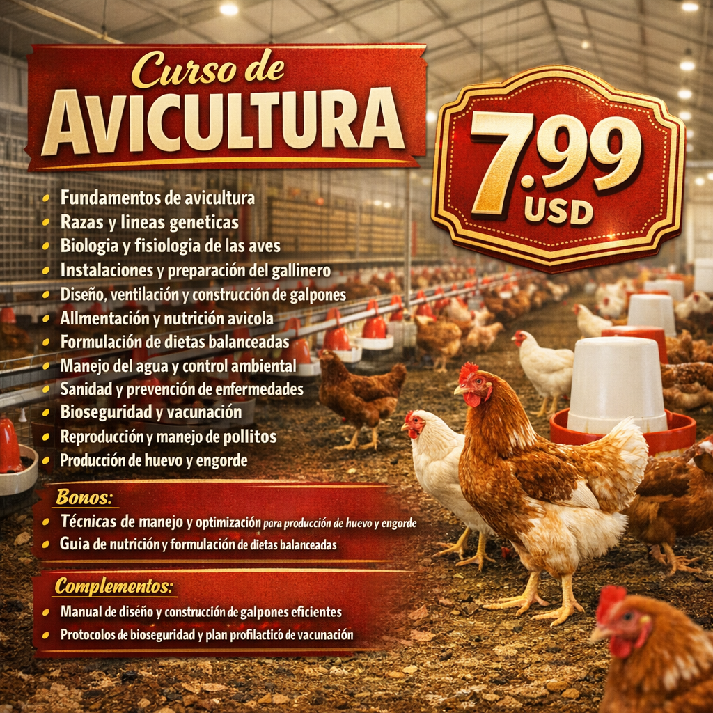 Este curso reúne una formación amplia, progresiva y cuidadosamente estructurada sobre avicultura. Desde los fundamentos biológicos hasta la gestión técnica de la granja, cada bloque de contenido está pensado para que puedas comprender, aplicar y mejorar tu producción avícola con criterios reales. No importa si estás comenzando desde cero o si ya tienes experiencia en el campo — aquí encontrarás las herramientas que necesitas para dar el siguiente paso.